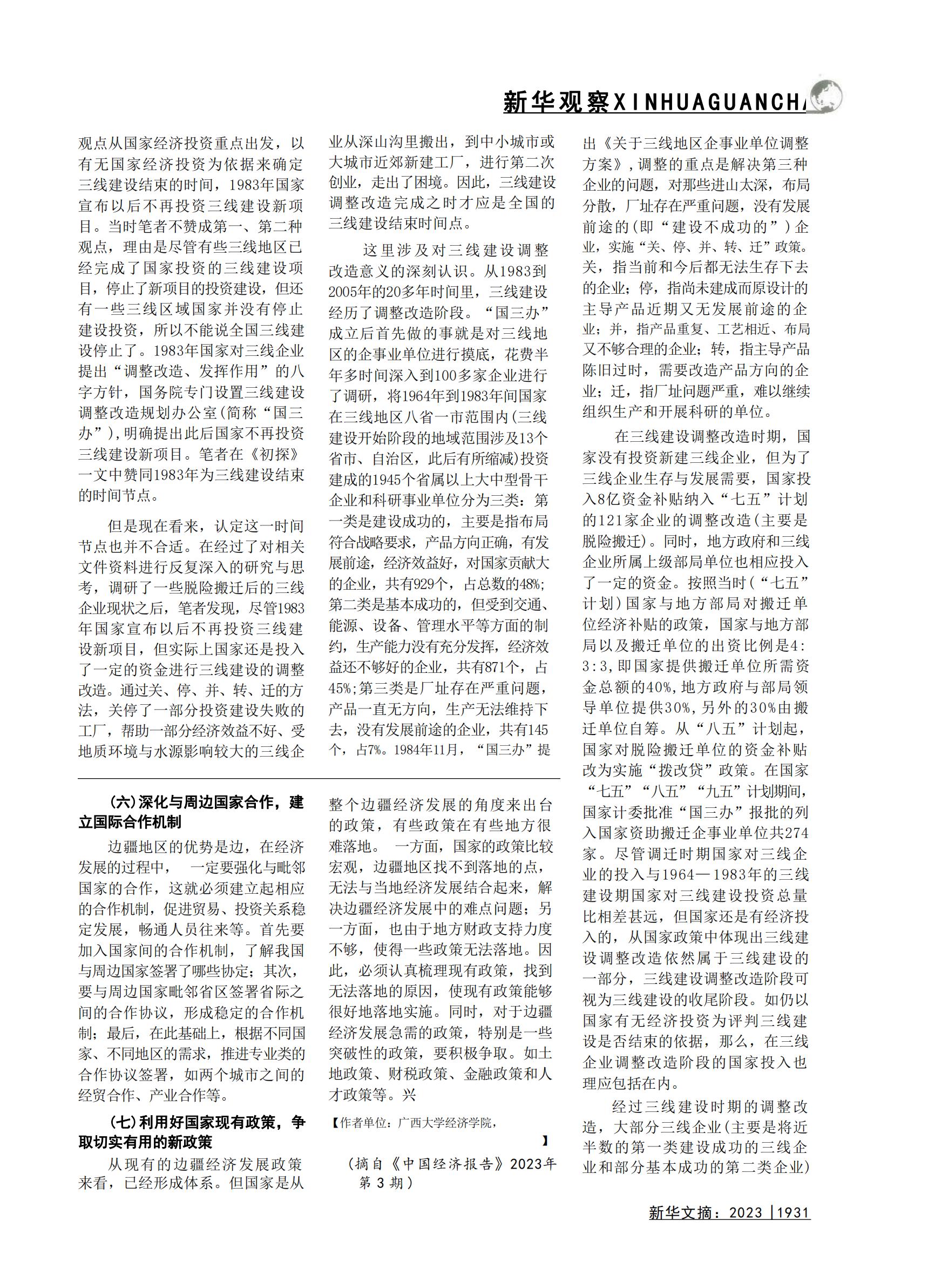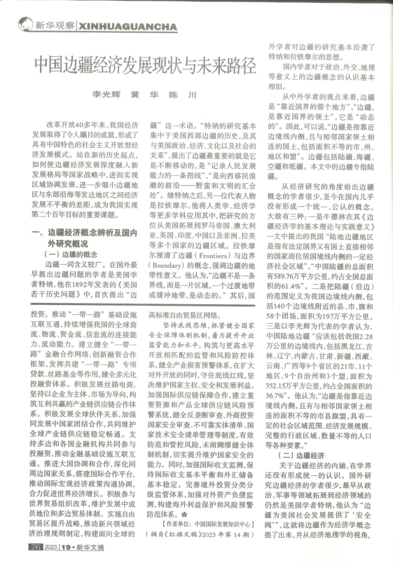 公司李光辉教授、黄华博士研究生撰写的论文“中国边疆经济发展现状与未来路径”全文被《新华文摘》(2023年第19期)转载,该论文曾发表在《中国经济报告》(2023年第3期)。