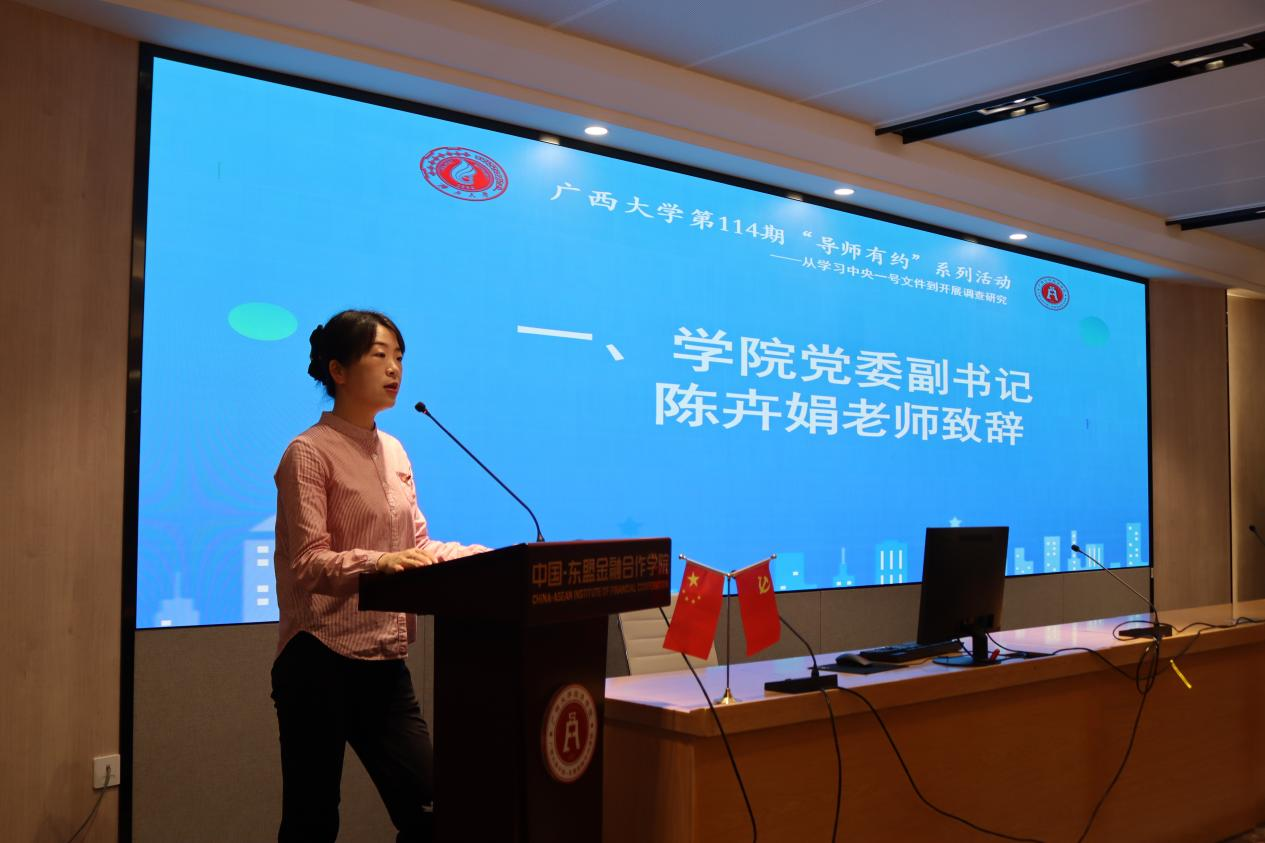 为深入开展学习贯彻习近平新时代中国特色社会主义思想主题教育工作会议,贯彻党的二十大推进高质量教育体系要求,响应公司“双一流”建设精神,4月20日晚上19:30,公司第一期“导师有约”暨伟德国际1946第104期系列活动在伟德国际1946101教室举办。本次活动的主讲嘉宾是公司金融系副教授陈新建,主题为“从学习中央一号文件到开展调查研究”。公司党委副书记、纪委书记陈卉娟,团委书记王海希出席本次活动。