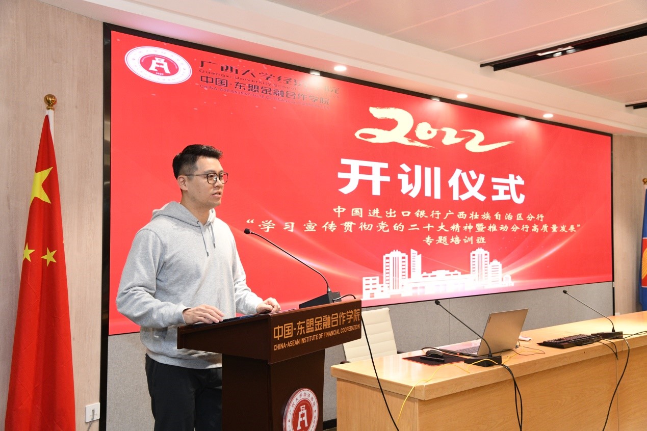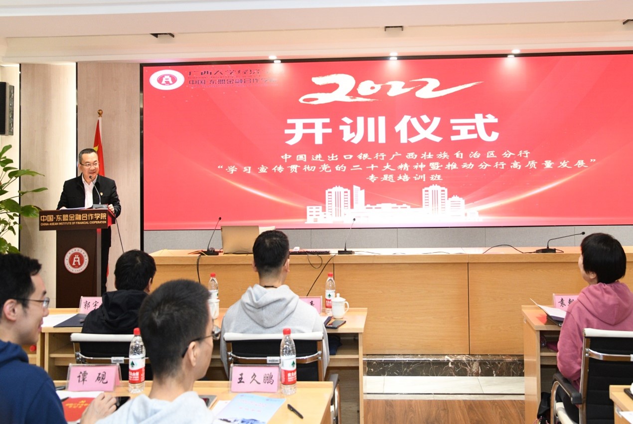 12月10日,中国进出口银行广西分行在伟德国际1946伟德国际1946/伟德国际1946举办以“学习宣传贯彻党的二十大精神暨推动分行高质量发展”为主题的专题培训。中国进出口银行广西分行彭豪行长、公司李光辉经理出席开班仪式并致辞。