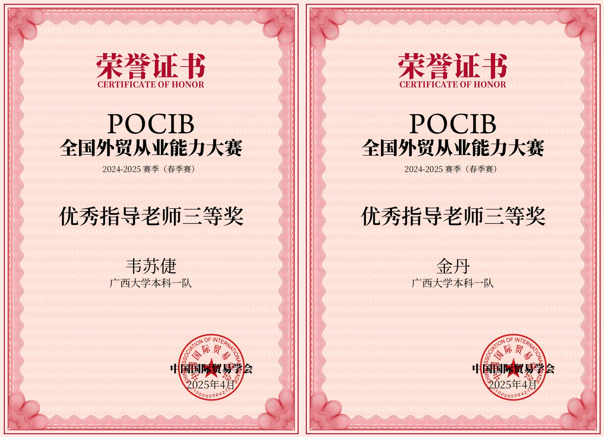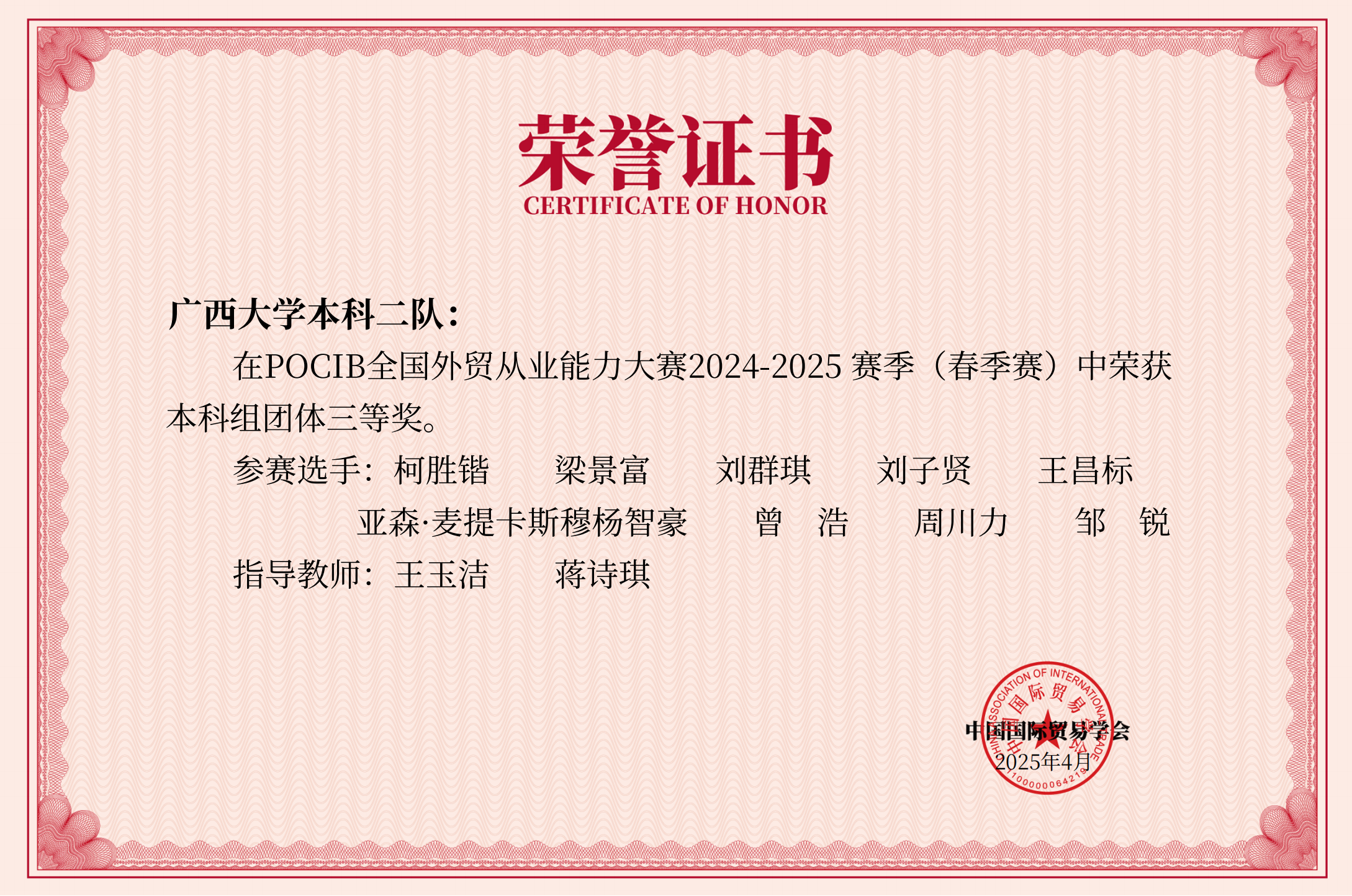 由中国国际贸易学会主办的第十四届POCIB全国外贸从业能力大赛(春季赛)于2025年4月19日上午落下帷幕,本届大赛共有来自 250 所院校的818支队伍、共计8180名选手参赛。公司参赛队伍经过13天的紧张比赛和不懈努力,最终在818支队伍中脱颖而出,荣获2项团体三等奖,并斩获参赛选手个人二等奖2项,个人三等奖14项,优秀指导老师三等奖4项。