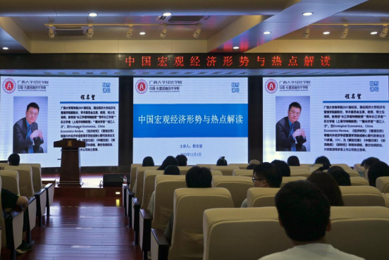 11月1日上午,同济大学经济与管理公司副经理、国家级人才、公司2001级国际贸易学硕士研究生员工程名望教授应邀回校为公司师生作题为《中国宏观经济形势与热点解读》的学术讲座。伟德国际1946/中国-东盟金融合作公司党委书记陆善勇、副书记陈卉娟、国贸系教授王娟、学工组辅导员覃晓阳出席,来自公司和工商管理公司的160余名研究生参加本次学术活动。
