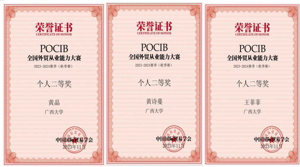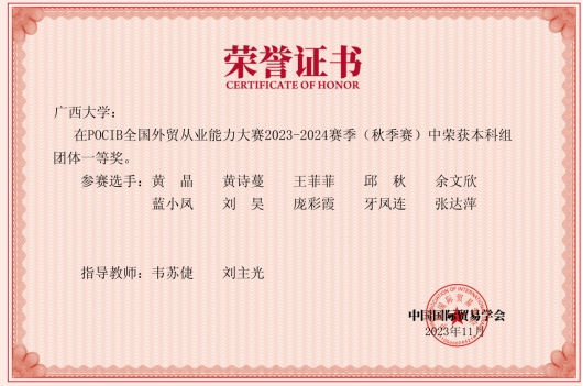2023年11月2日至11月14日,由伟德国际1946/中国-东盟金融合作公司10名国贸系员工组成的代表队参加了POCIB全国外贸从业能力大赛2023-2024赛季(秋季赛)。该项大赛赛前经过一个月的预选和准备阶段,正式比赛历时13天,共有373所院校、1056支队伍、共计10560名选手参加。在韦苏倢、刘主光两位老师的指导下,10名队员经过13天起早贪黑的业务操作,不懈努力,最终在1056支队伍中脱颖而出,以团体总分915.64的优异成绩,荣获POCIB全国外贸从业能力大赛2023-2024赛季(秋季赛)的团体一等奖。此外,团队还收获参赛选手个人二等奖3项,个人三等奖2项,指导教师一等奖2项。十位参赛选手在比赛中业务能力过硬,均获得中国国际贸易学会颁发的外贸从业资格证书。