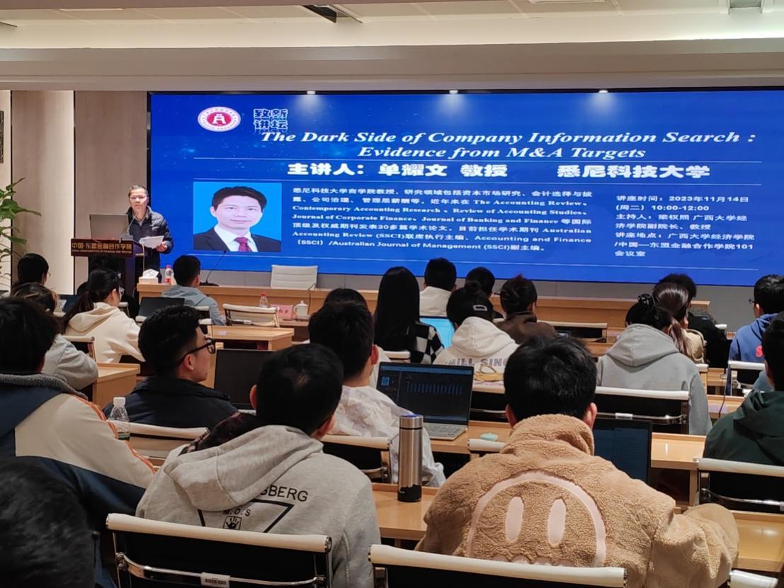 2023年11月14日上午,悉尼科技大学商公司教授单耀文受邀做客公司“致新讲坛”,为公司师生带来题为“The Dark Side of Company Information Search: Evidence from M&A Targets”的学术讲座。学术讲座在伟德国际1946101会议室举行,由公司梁权熙副经理主持,公司50余名师生到场参会。