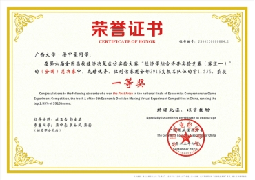 全国高校经济决策虚仿实验大赛由中国商业经济学会主办,顺应数字经济发展趋势,助力提高员工的决策思维能力和经济数据分析能力,培养员工的创新能力和团队合作精神。本届比赛包括五个赛道,均由区域赛+全国赛、虚拟仿真决策+数据分析报告环节组成。今年是公司第二年组队参加该项大赛,呈现三个新特点。一是筹备早:公司经济学系盛玉雪和郭南芸老师从5月初便开始召集参赛队伍课外集训。二是校内外联合:在校内训练基础上,也通过与广西外国语公司组织友谊赛等形式不断提升比赛水平。三是有突破:赛道一“经济学综合博弈实验竞赛”中,通过与来自全国244所高校的3916支队伍的竞技后,公司5支队伍进入全国赛。在去年最好成绩仅为全国二等奖的基础上,今年由梁中豪、莫如凤、梁茜同学组成的团队获得了全国一等奖的重大突破,他们提交的数据分析报告更是获得了全国第二的傲人成绩;此外,由刘安基、赵曼璐、孙雪琳组成的队伍代表公司首次参加赛道四“国际经济分析与决策竞赛”的比赛便荣获了全国二等奖的好成绩。