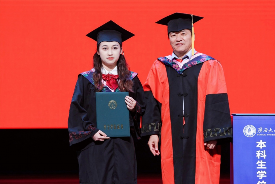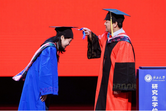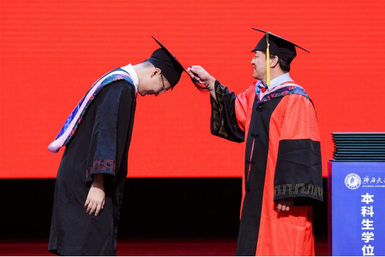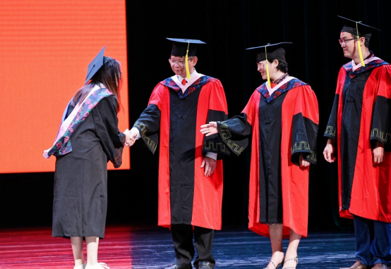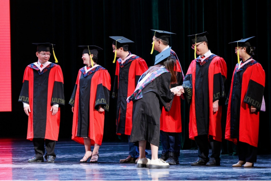 毕业典礼至此圆满结束,学位授予仪式正式开始。伟德国际1946第十四届学位委员会委员、伟德国际1946学位评定分委员会主席李光辉经理为2023届毕业生逐一拨穗、授予学位,公司学位评定分委员会各位委员在主席台上肃立见礼、与毕业生一一握手。