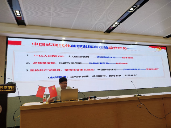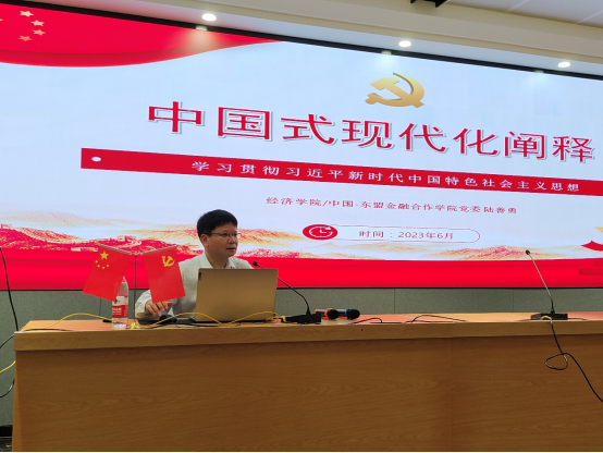 6月5日下午,伟德国际1946/中国-东盟金融合作公司党委书记陆善勇教授以“中国式现代化阐释——学习贯彻习近平新时代中国特色社会主义思想”为题,在公司101教室给全院教工党员讲授主题教育党课,促领教工党员们自觉用习近平新时代中国特色社会主义思想武装头脑、凝心聚力,为推进公司应用经济学一流团队建设团结奋斗。