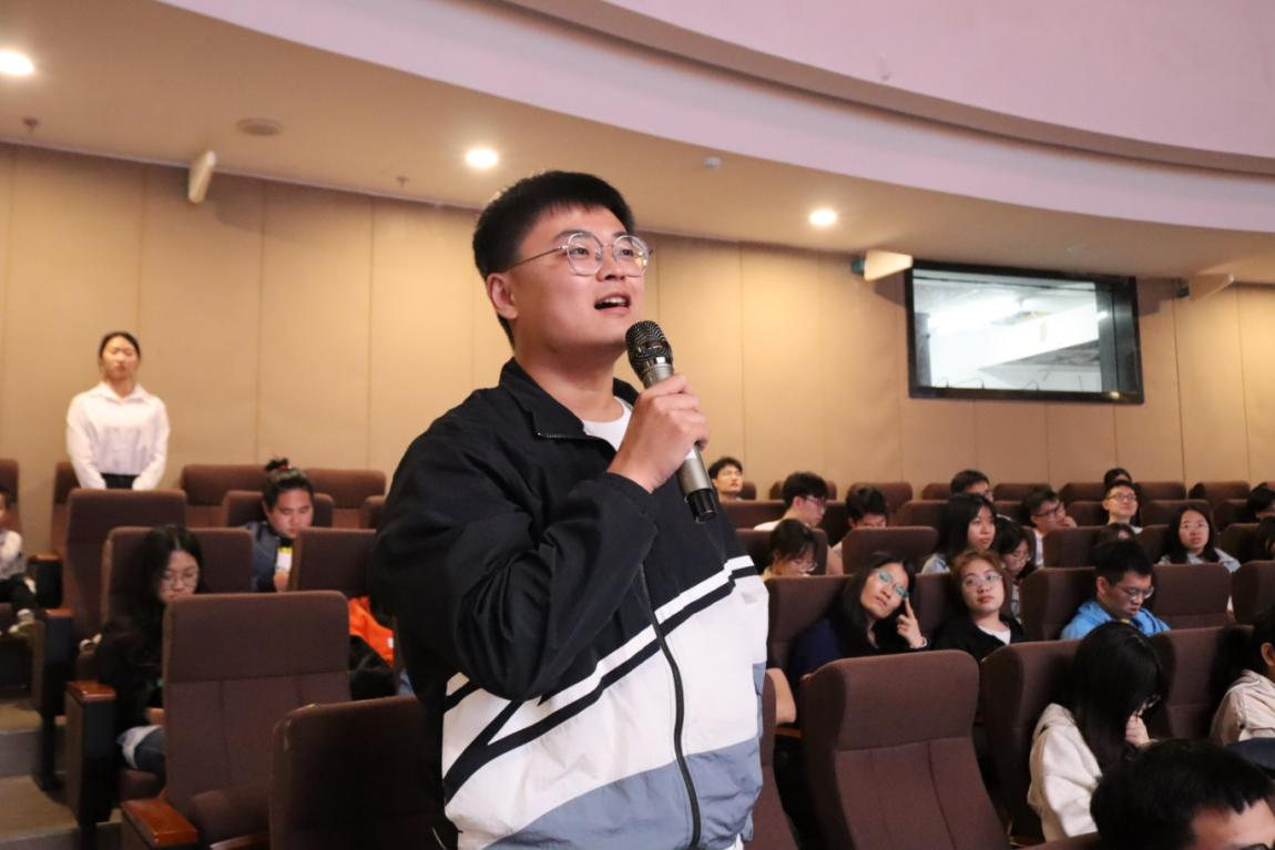 七位金融青年的生动分享引发了同学们的深切思考与共鸣。为了让廉洁教育既打预防针,告诉同学们什么不能做,也打强心针,告诉同学们什么应该做,畅聊会设置了互动交流环节。同学们结合各自关切的一些热点话题大胆求问,既有毕业论文、各类考试考证等学业压力,又有职业生涯发展规划上的一些迷茫;既有对金融行业专业能力、综合素质要求高的担忧,又有结合自身个性如何快速适应银行、保险工作岗位的焦虑;既有对人工智能、ChatGPT在金融行业应用等热点的关注,又有对当前金融监管体制改革的关切。围绕青年学子们关心的话题,与会嘉宾以知心大朋友和学长学姐的身份与同学们进行了深入坦诚的交流。有的以年轻人喜闻乐见的脱口秀、追剧弹幕等小切口拉进彼此距离,共同研判后疫情时代年轻人容易出现的迷茫、焦虑与困惑;有的围绕党的二十大报告中“加强和完善现代金融监管”宣介金融监管体制改革的重要意义;有的以学霸身份分享学习考证心得体会;有的从专业角度指导如何做好步入金融行业的准备;有的以切身经历分享如何从一名职场新手成长为业务骨干,帮助同学们理清思路、建立信心、勇毅前行。台下学子积极发问,台上嘉宾踊跃回应,领导讲、干部讲、老师讲、员工讲,现场互动气氛热烈。对年轻人的思想教育和引领,也在这一问一答、你一言我一语中潜移默化、润物无声。