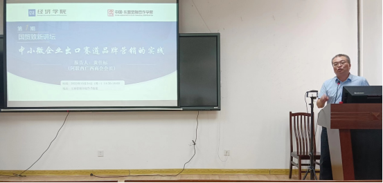 黄仕标老师具有十分丰富的实操经验,从事外贸业务工作34年,有着国企、央企、民企和跨国集团海外工作经历和管理经验。讲座中,黄老师从“牛肉面大王”李北祺先生的创业经历引入,结合广西桂北的恭城油茶和陕北地区的洛川苹果品牌两个营销实例,围绕出口品牌的营销困境、产品定位与产品落地三个方面做了细致的分析,为同学们解答了中小企业如何利用出口赛道快速高效创建企业品牌的问题。