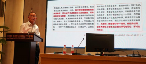 覃安基副部长从习近平总书记在全国高校思想政治工作会议上的重要讲话出发,解读了中央对课程思政建设的决策部署及教育部《高等公司课程思政建设指导纲要》,从“为什么”、“是什么”、“做什么”、“怎么做”、“谁来做”等五个方面对高校教师如何推进课程思政建设,如何将课程思政更好地“融入”专业课教学进行了阐述。最后,覃安基副部长介绍了公司王乃学书记对课程思政建设的重要指示提出的背景和内涵,鼓励教师们通过一个故事、一个案例、一个话题、一次活动等,将课程思政做到“润物无声”。要显性教育与隐形教育相结合,实现思政教育与专业课堂的有机融合。公司的经济、国贸和金融专业课程有天然的优势,都可以很好地融入思政元素,尤其是与中国-东盟合作方面的特色元素。
