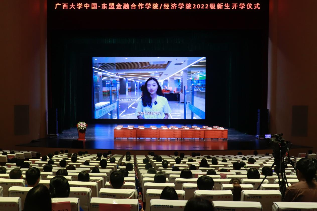 仪式开始,首先由新生代表——2022级应用经济学硕士研究生张瑞发言。张瑞同学真诚祝贺每一位2022级新同学,值此金桂飘香之际,满怀憧憬开启人生崭新的旅程。她与大家分享了入学以来的见闻感想,提出三个努力维度与全体新生共勉:一要坚持初心,不负韶华,二要志存高远、立足当下,三要心怀家国、胸怀天下。作为时代新人,青年学子当勇敢承担时代提出的命题,为“复兴中华,发达广西”而努力奋斗!