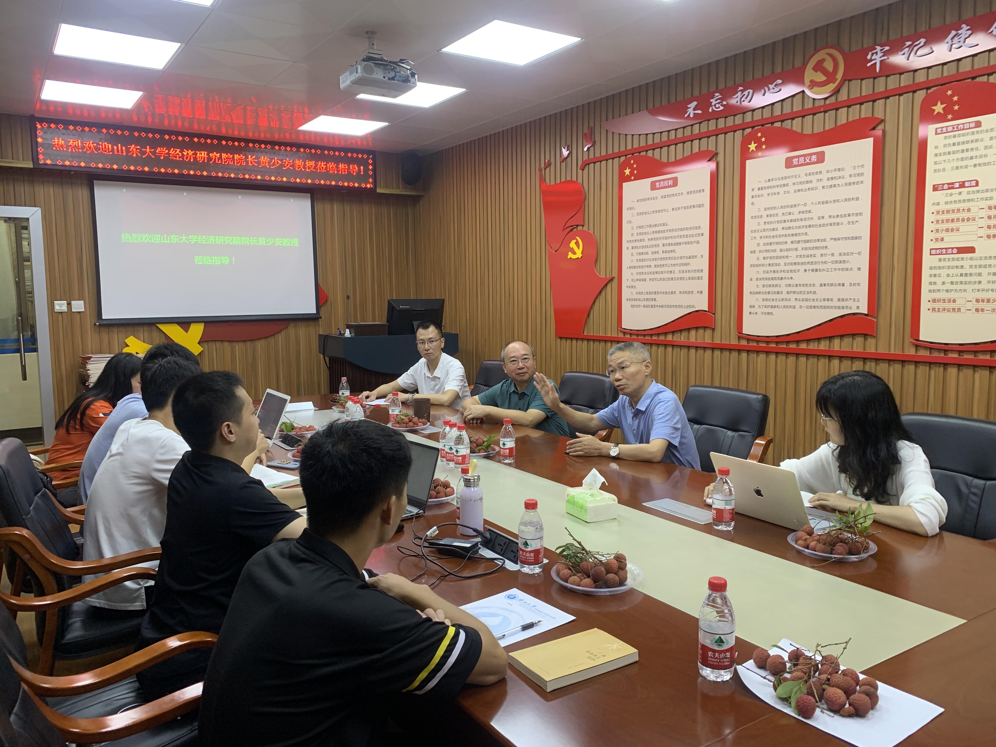 黄少安教授长期关注中国经济发展重大现实问题,致力于产权理论、企业理论、制度经济学和农村经济问题研究,取得了一系列有重大社会影响力的学术成果。黄少安教授结合目前国内外经济发展现状及其相关学术研究状况,鼓励教师和员工坚守科研道德,树立正确的学术观念,踏实做有用的科学研究。针对课题和论文选题问题,黄少安教授结合国有企业改革、“双减”政策、碳减排等进行了深入客观的分析,指出科学研究要在科学、准确、动态地学习中央和国家政策文件的基础上,结合科学理论方法,提炼有学术价值的研究问题,研究有社会价值的科学问题。
