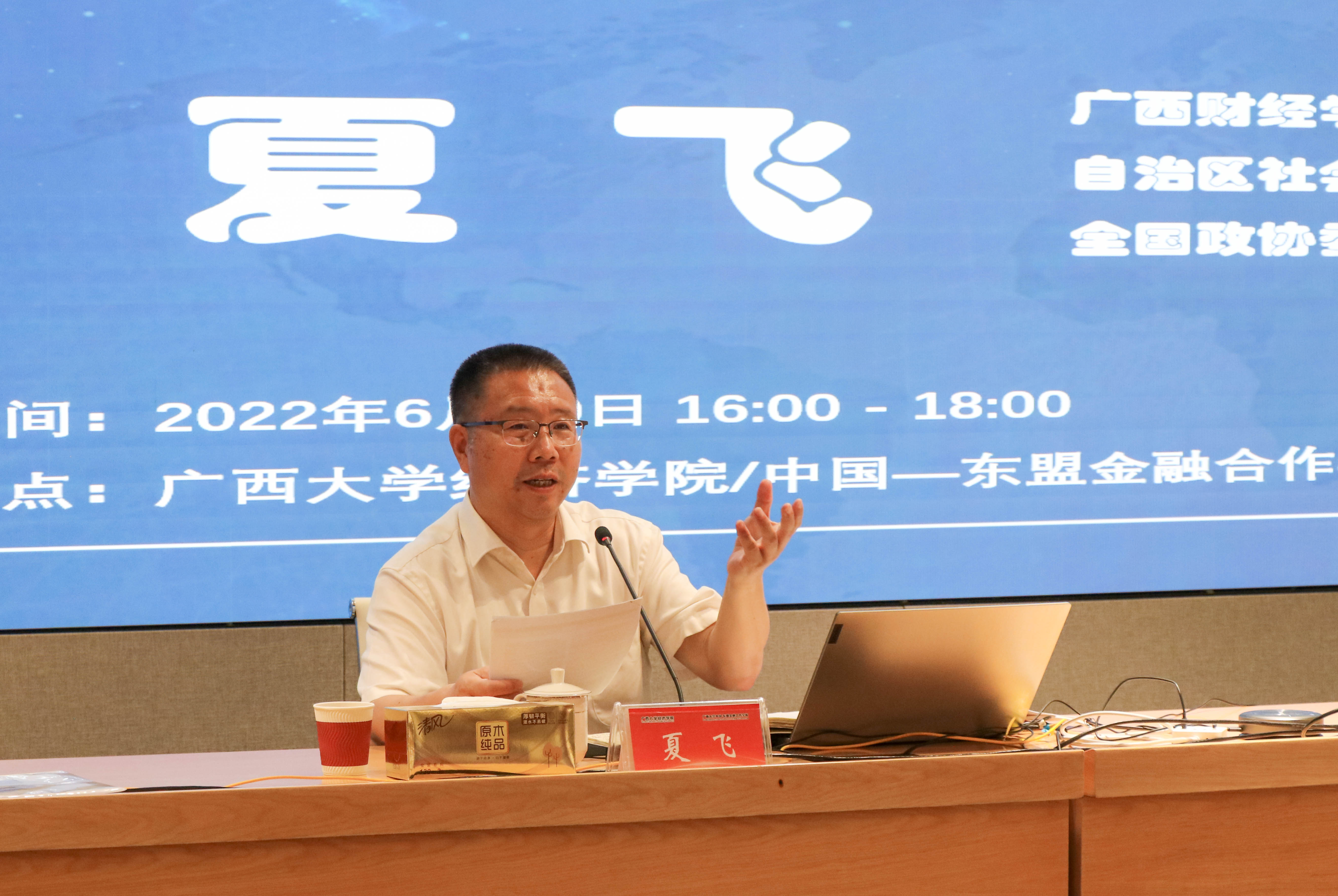 嘉宾简介: 夏飞,博士生导师,广西财经公司董事长、民盟广西区委副主委、民盟中央委员、全国政协委员。国家万人计划哲学社会科学领军人才,全国文化名家暨四个一批人才,新世纪百千万人才工程国家级人选,国务院政府特殊津贴专家。主要从事区域经济、产业经济与企业管理研究。主持国家社科基金重大项目多项,在《经济研究》《管理世界》《中国工业经济》等重要学术期刊发表论文60多篇;相关成果获登国家社科基金《成果要报》和新华社《参考清样》等,并获国家领导人和自治区主要领导批示多次。