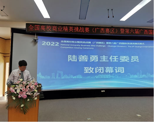 近日,全国高校商业精英挑战赛(广西赛区)暨第六届广西国际贸易竞赛选拔赛以线上、线下结合的形式顺利举行,此次大赛由广西高校经济与贸易类本科专业教学指导委员会等单位倾力主办,广西高校经济与贸易类本科专业教学指导委员会主任委员、公司党委书记陆善勇教授致闭幕辞,并为获奖队伍颁奖。广西高校经济与贸易类本科专业教学指导委员会秘书长、公司国贸系王娟教授全程参与,并指导公司代表队。公司代表队(广西怡凯家居用品有限公司)首次参赛获得广西赛区三等奖,意味着拿下6月将在宁波举办的全国总决赛“入场券”。