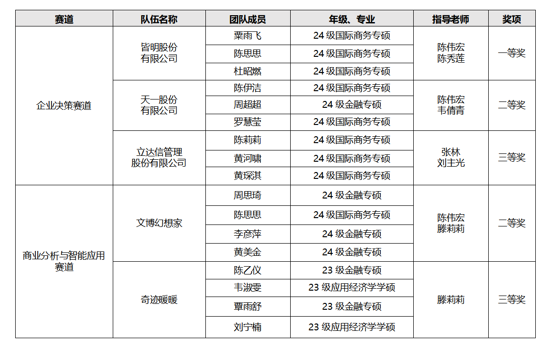 公司参赛选手在全国初赛、复赛中一路过关斩将,最终在总决赛中表现优异、力压群雄,一共斩获企业决策赛道全国一等奖1项(赛事最高奖项)、二等奖1项、三等奖1项;商业分析与智能应用赛道全国二等奖1项、三等奖1项。其中,企业决策赛道全国一等奖由陈伟宏、陈秀莲老师指导的伟德国际1946“皆明股份有限公司”代表队获得(队员:2024级国际商务专硕粟雨飞、陈思思、杜昭燃)。与此同时,公司陈伟宏副教授和陈秀莲教授获评“优秀指导教师”,伟德国际1946获颁“优秀组织奖”。