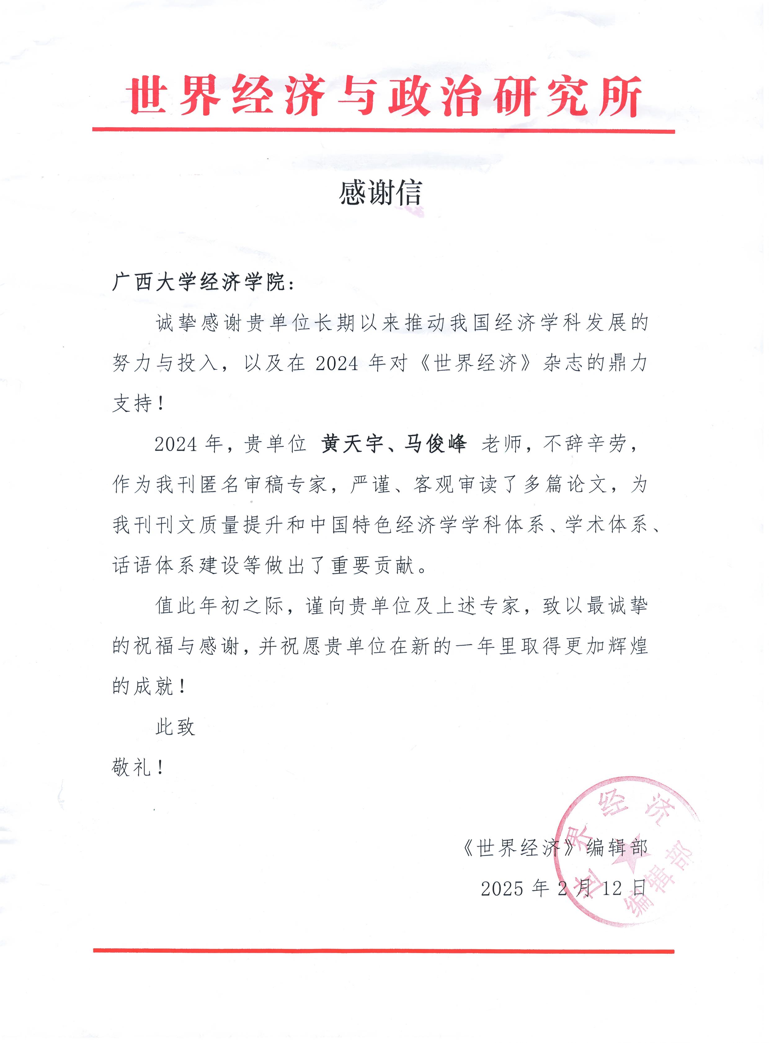 近日,世界经济与政治研究所《世界经济》编辑部向公司发来感谢信,感谢公司在2024年对《世界经济》杂志的鼎力支持,对公司教师黄天宇、马俊峰担任该刊匿名审稿专家期间的卓越贡献表示感谢。作为审稿人,他们以严谨的学术态度、深厚的专业素养和客观公正的评审标准,审读了多篇学术论文,为杂志的刊文质量提升做出了重要贡献,为中国特色经济学学科体系、学术体系、话语体系建设提供了有力支持。