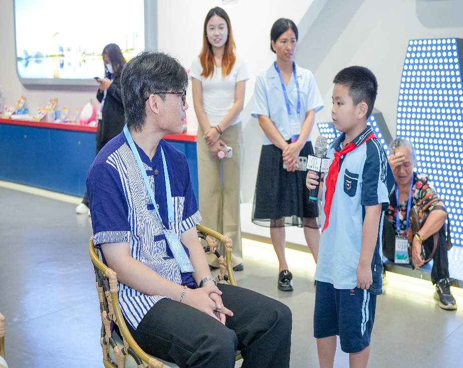 高佳恩、郭梓萱在中国—东盟特色商品汇聚中心广西馆与小员工互动