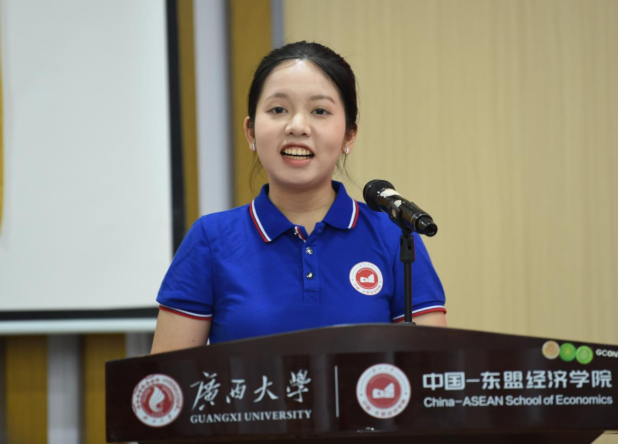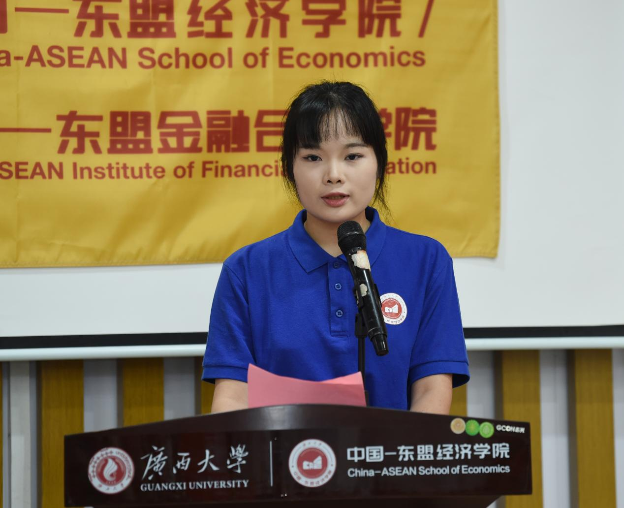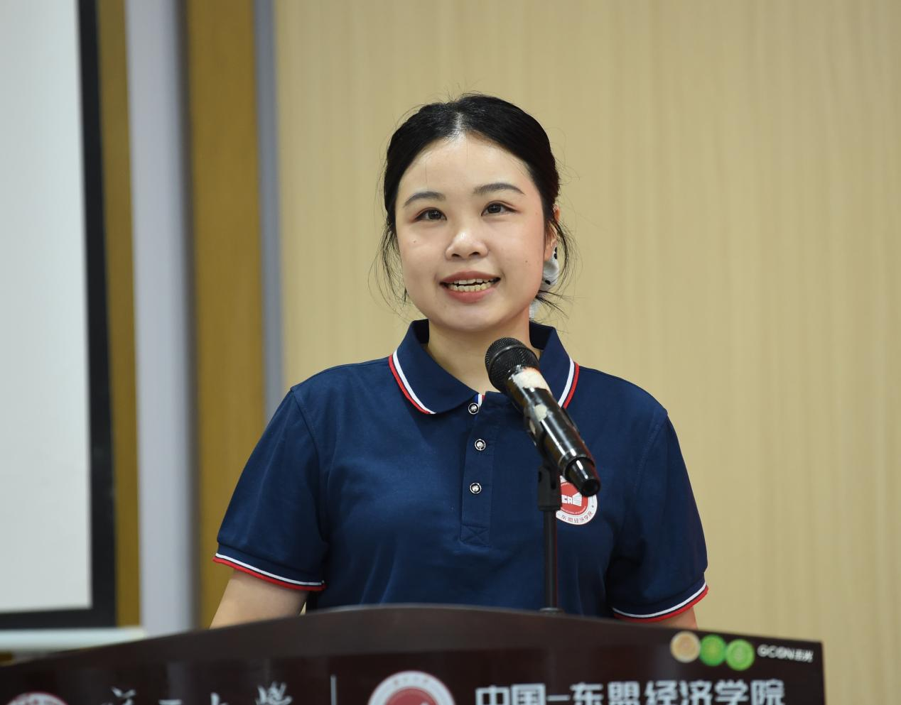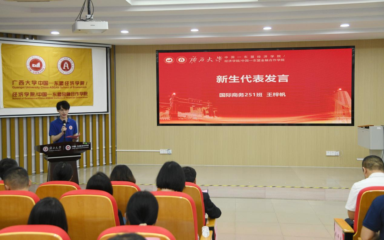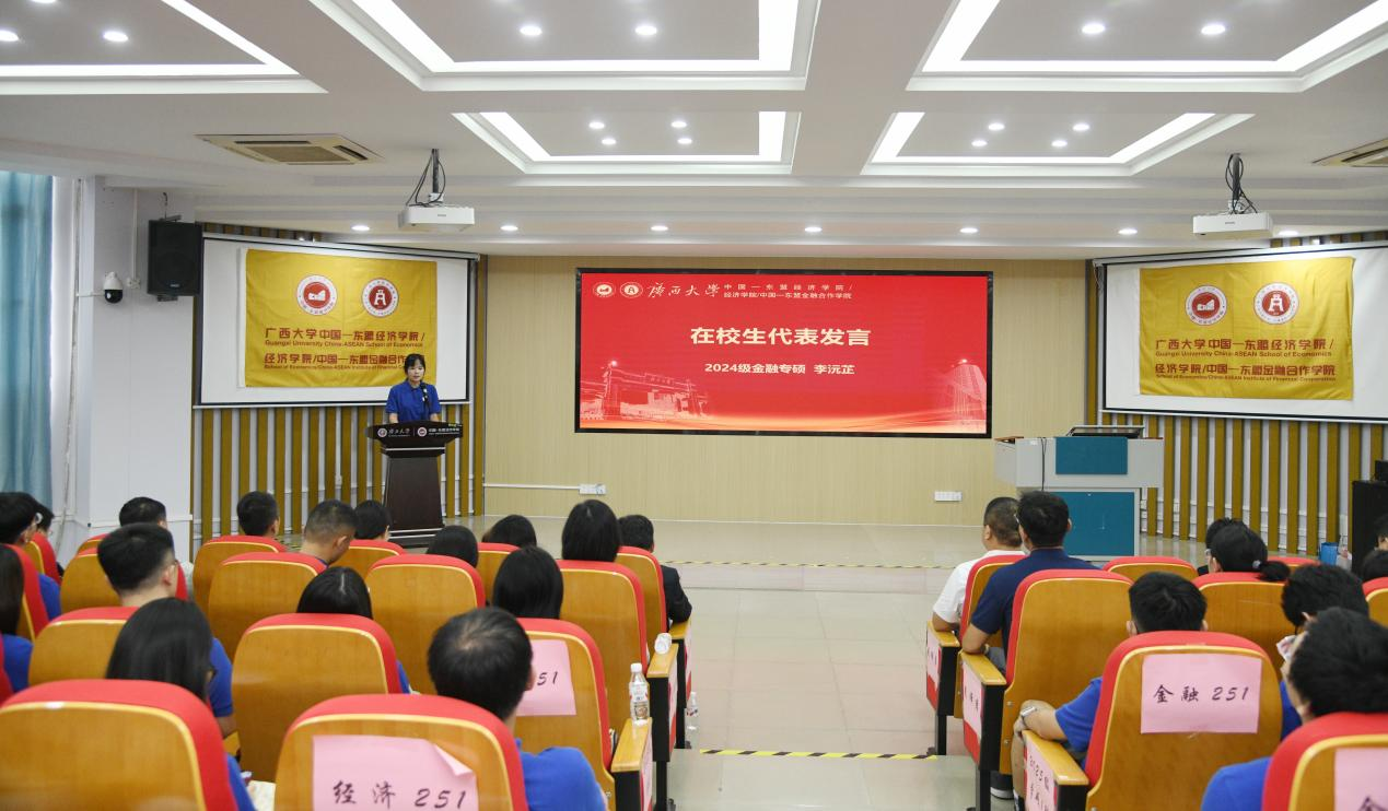 公司研究生会主席团成员、2024级金融专硕的李沅芷以“扎根、破界、坚守”为关键词,为新生们提出了三点建议:她鼓励新生深入中国—东盟合作一线,厚植家国情怀;善用国际化平台,拓展全球视野;保持热爱与信念,锤炼研究能力和职业品格。最后,她也祝愿新生们学有所成、青春无悔。